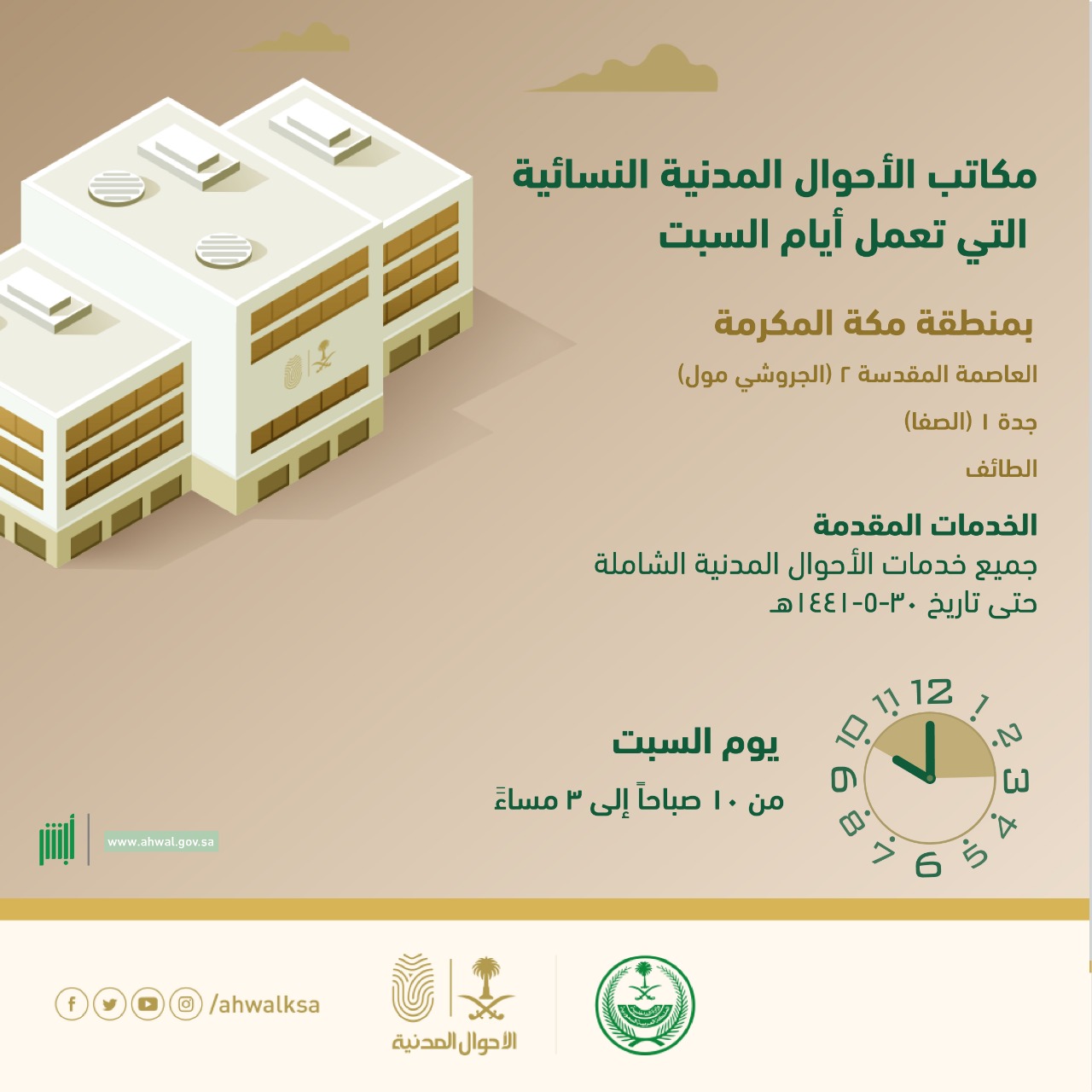 الاحوال المدنية مكة. واس استقبل صاحب السمو الملكي الأمير مشعل بن ماجد بن عبدالعزيز محافظ جدة اليوم مدير عام الأحوال المدنية بمنطقة مكة المكرمة عبدالمنعم الشهري. دشنت الأحوال المدنية بمنطقة مكة المكرمة تدشن مكتبين للرجال والنساء لتقديم خدمات السجل المدني للمواطنين والمواطنات وقد تم إدراجهما في نظام المواعيد الإلكترونية على منصة أبشر. واط لع سموه على تقرير أعمال ومنجزات وإحصاءات مكاتب الأحوال المدنية.