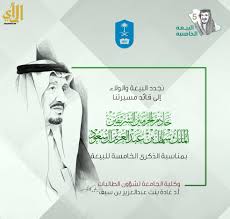 البيعة الخامسة للملك سلمان. كلمه عن البيعة الخامسة للملك سلمان بيعة الملك سلمان بن عبد العزيز آل سعود خادم الحرمين الشريفين تمت في عام 2015م إذ ي صادف يوم 3ربيع الآخر عام 1441هـ 30 نوفمبر 2019م الذكرى الخامسة لبيعة ملك البلاد المعظم حفظه الله ورعاه. في ذكرى البيعة الخامسه لتولي الملك سلمان بن عبدالعزيز آل سعود مقاليد الحكم تماسك بين القيادة والشعب وفاء وولاء وتلاحم وانتماء كل هذا عناوين هذا الكيان ورؤية تؤسس لغد زاهر مشرق بإذن الله حفظ الله مليكنا وولي عهده الأمين ودام. عندما تتابع النساء من مختلف دول العالم اليوم السبت احتفاء المملكة العربية السعودية بذكرى البيعة الخامسة لخادم الحرمين الشريفين الملك سلمان بن عبدالعزيز آل سعود وتوليه مقاليد حكم البلاد سينظرن بإعجاب إلى المرأة السعودية.