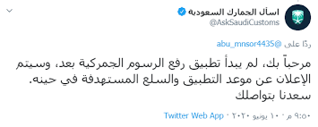 الجمارك السعودية تويتر. أعلنت الجمارك السعودية اليوم الخميس عن إعفاء المركبات الأجنبية المتأخرة عن المدة المسموح لها داخل المملكة من الغرامات على أن يتم إخراج المركبة خلال 30 يوم ا. أسباب قد تؤخر شحنات عملاء المتاجر الإلكترونية أوضحت الهيئة العامة للجمارك السعودية الأسباب التي قد تسبب تأخر وصول السحنات لعملاء المتاجر الإلكترونية كما كشفت هيئة الجمارك الحالة التي تعفى فيها البضاعة. عيد أبطال الجمارك 2020 08 12 المجلة مجلة الجمارك العدد 69 مجلة 2018 10 01 إعلان الضوابط الجديدة التي أقر تها الهيئة العامة للغذاء والدواء لتحديد كميات منتجات التبغ المسموح استيرادها.