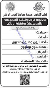 وزارة الحرس الوطني الشؤون الصحية بالحرس الوطني البريد الالكتروني المركز الاعلامي english toggle navigation المدن الطبية. تعلن وزارة الحرس الوطني عن أسماء 144 متقدما على وظائفها والمعلنة في 1440 4 16هـ على موقع الوزارة الإلكتروني لإجراء المقابلة الشخصية في حين تدعو الوزارة من المعلنه أسمائهم مراجعة إدارة شئون الموظفين بالمقر الرئيسي.
