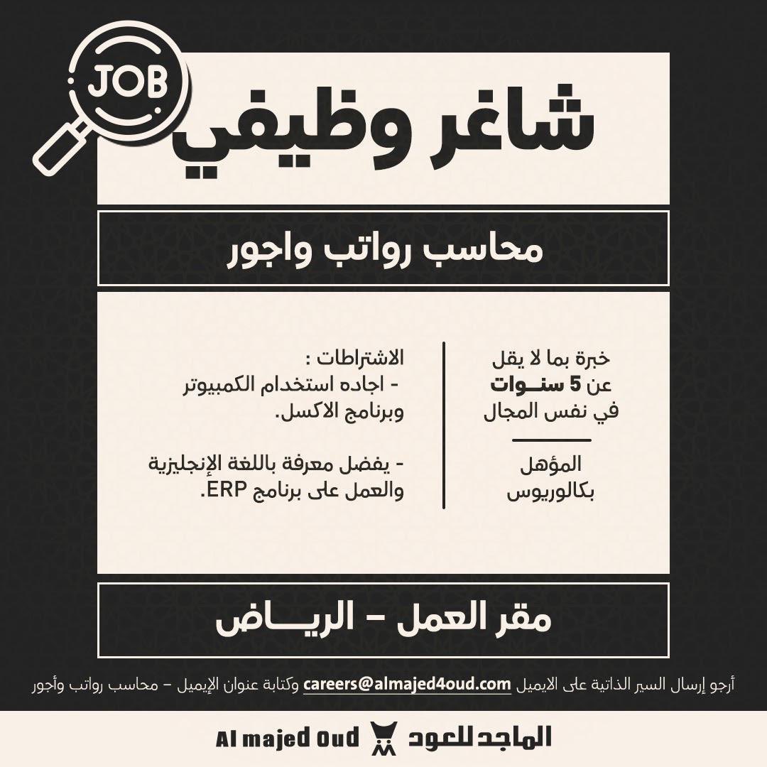 الراتب من 4500 حتى 5700 ريال عمولة مجزية شهرية تامين طبي للموظف وعائلته. أعلنت شركة الماجد للعود عبر صفحتها الرسمية بموقع بيت كوم توفر وظائف إدارية للرجال والنساء بمدينة الرياض للعمل بالمسميات التالية باحث وممثل قانوني ومدير التسويق ومدير المبيعات وباحث قانوني وأخصائي رواتب ومشرف. شركة الماجد للعود اعلنت عن توفر وظائف متنوعة شاغرة للعمل في الشركة وفروعها بمختلف مناطق المملكة وذلك وفق التفاصيل والشروط والمعلومات الواردة في هذا الاعبلان والموضحة ادناه الوظائف المتاحة 1 محاسب رواتب وأجور درجة.