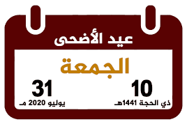 ويوافق أول أيام عيد الاضحى في السعودية يوم الجمعة الموافق الحادي والثلاثين من يوليو 2020.