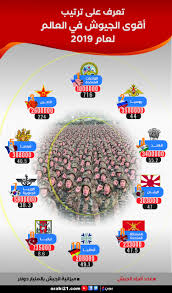 ترتيب اقوى جيوش العالم. ويعتمد الترتيب على مؤشر القوة الذي يحدد الموقع لكل دولة على أساس تقييمات تركز على أكثر من 50 عاملا يضمن جاهزية القوات المسلحة. ترتيب أقوى الدول و الجيوش عسكريا 2019 اعتمدت الدراسة في تقييمها على مجموعة من المعايير هي النفوذ السياسي والمالي للدولة قوة تحالفاتها الدولية قوتها العسكرية وأخيرا طريقة إدارتها للقضايا الدولية. جيش الهند جيش فرنسا.