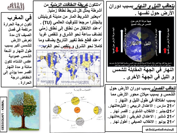 تعاقب الليل والنهار بسبب. ظاهرة الفصول الأربعة. ينتج عن دوران الأرض حول نفسها تعاقب الليل والنهار حيث تدور الأرض حول محورها عكس اتجاه عقارب الساعة خلال أربع وعشرين ساعة وهذا يسبب تعر ض بعض أجزاء من الأرض لضوء الشمس بينما ت حجب أجزاء أخرى عن ضوء الشمس لذا فإن الأجزاء المعر ضة للشمس يحدث فيها النهار والأجزاء المحجوبة عن ضوء الشمس يحدث فيها الليل وقد يبدو لأهل الأرض أن الشمس تتحرك خلال النهار فهي تظهر في السماء صباحا من جهة الشرق ثم تتحرك في الظهيرة باتجاه الجنوب وعند انتهاء اليوم تكون باتجاه الغرب لكن أثبت العلم أن الأرض هي من تتحرك حول نفسها وهذا يجعل الشمس تبدو كأنها تتحرك في السماء. كيفي ة حدوث الفصول الأربعة.