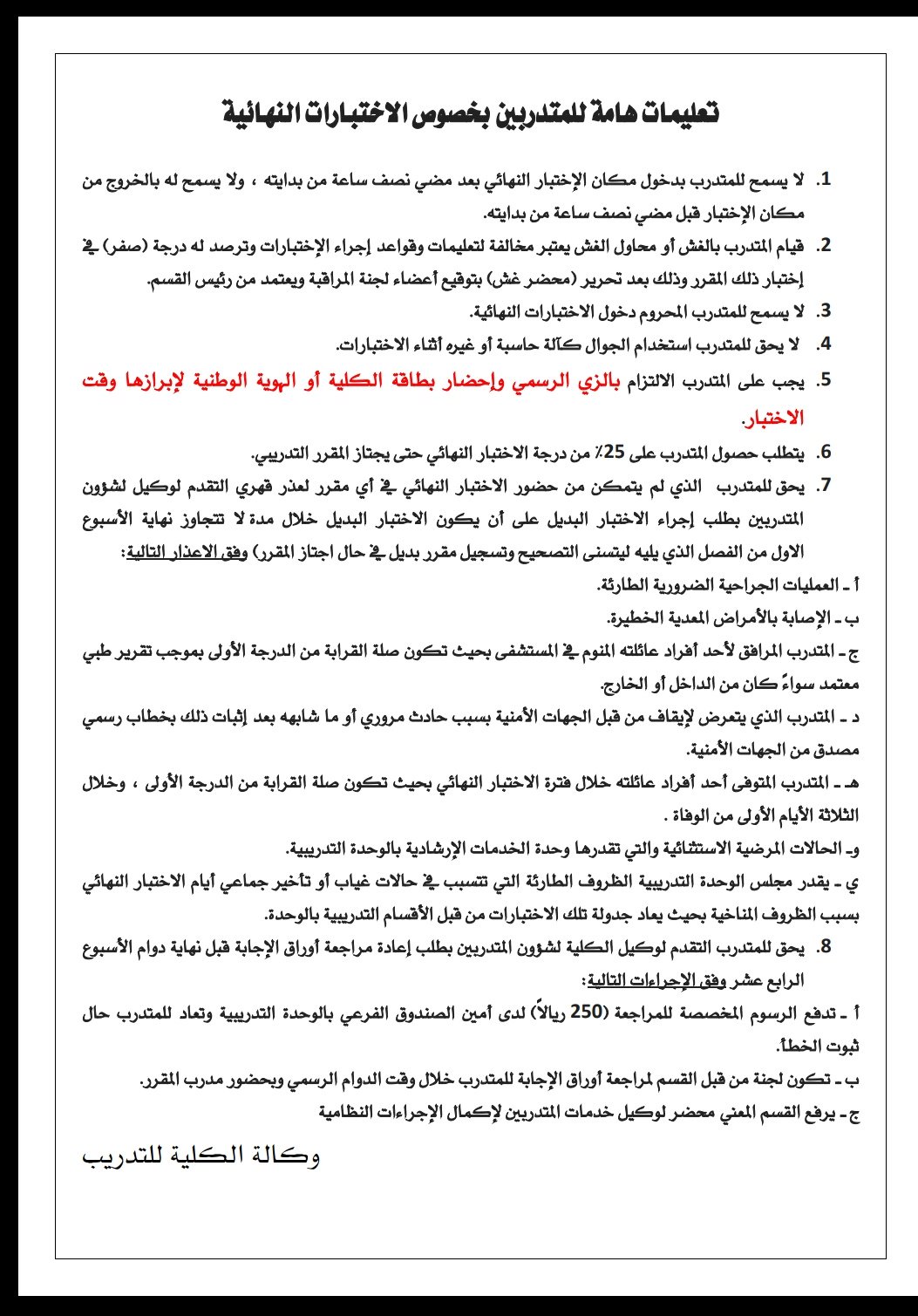 تعليمات الاختبارات النهائية للطلاب والطالبات تتوجه وكالة الكلية للشئون التعليمية والأكاديمية بالتحية لجميع طلاب وطالبات الكلية وترجوا لهم أداء الاختبارات النهائية لهذا الفصل بشكل سلس وم ي سر وحتى نتفادى تعرض.