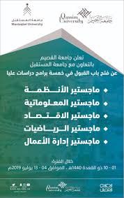 تعلن عمادة الدراسات العليا في جامعة القصيم بالتعاون مع جامعة المستقبل عن بدء التقديم الالكتروني على برامج الدراسات العليا لمرحلة الماجستير اعتبارا من يوم الاحد الموافق 21 11 1441هـ وحتى يوم السبت الموافق 27 11 1441هـ للعام. تعلن عمادة الدراسات العليا عن بدء التقديم الإلكتروني على برامج الدراسات العليا اعتبارا من الإثنين الموافق 1439 06 03هـ وحتى يوم الأربعاء الموافق 1439 06 19هـ في مرحلتي الماجستير والدكتوراه للعام الدراسي الجامعي 1439 1440هـ. بوابة التقديم في جامعة القصيم تسجيل الدخول تسجيل الدخول الآن متاح من بوابة الزوار اذا لم يسبق لك التسجيل من بوابة الزوار سجل من جديد.