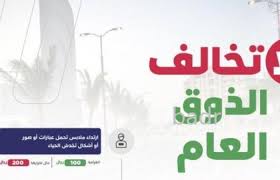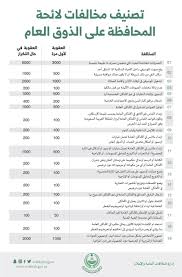 جدول مخالفات الذوق العام. لائحة الذوق العام وتستند لائحة الذوق العام على مجموعة من المخالفات المالية في المرة الأولى ومضاعفتها في حال تكرر الأمر على أن تبدأ الغرامات من 50 ريالا في مخالفة مثل تخطي طوابير الانتظار بمكان عام. ومن بين مخالفات الذوق العام المنصوص عليها في اللائحة التصرفات الخادشة للحياء التي تتضمن تصرفات ذات طبيعة جنسية ورفع صوت الموسيقى داخل الأحياء السكنية وتشغيل الموسيقى في أوقات الأذان وإقامة الصلاة وإلقاء النفايات. ومن ضمن مخالفات الذوق العام المنصوص عليها في اللائحة التصرفات الخادشة للحياء التي تتضمن تصرفات ذات طبيعة جنسية ورفع صوت الموسيقى داخل الأحياء السكنية وتشغيل الموسيقى في أوقات الأذان وإقامة الصلاة وإلقاء النفايات.