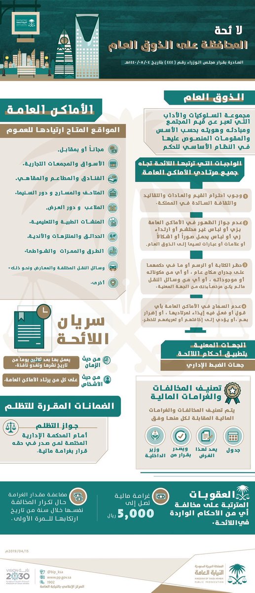 غرامات من 50 إلى 6000 دخلت الضوابط الخاصة بتطبيق لائحة الذوق العام حيز النفاذ في السعودية بعدما وافق عليها وزير الداخلية الأمير عبدالعزيز بن سعود بن نايف والتي حددت 19 مخالفة يعاقب مرتكبها بغرامات. جدول مخالفات الذوق العام في نهاية العام الماضي 2019 أقرت حكومة المملكة العربية السعودية قانونها الخاص بالذوق العام وهو جدول مخالفات الذوق العام وما يستحق العقوبة ومن بين هذه المخالفات. ومن بين مخالفات الذوق العام المنصوص عليها في اللائحة التصرفات الخادشة للحياء التي تتضمن تصرفات ذات طبيعة جنسية ورفع صوت الموسيقى داخل الأحياء السكنية وتشغيل الموسيقى في أوقات الأذان وإقامة الصلاة وإلقاء النفايات.