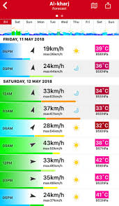 في ما بعد الظهر لارتفاع درجة حرارة الارض درجة حرارة الهواء تصل إلى 43 c نقطة الندى. 46 درجة الحرارة الصغرى المتوقعة في الخرج. شمالية الى شمالية شرقية سرعة الرياح.
