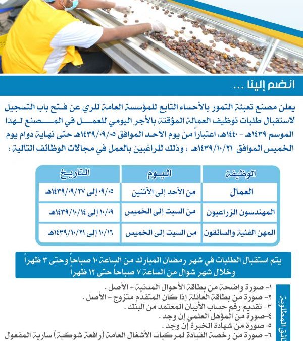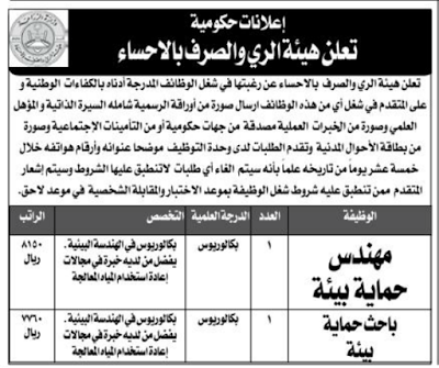 تعلن المؤسسة العامة للري عن توفر وظائف شاغرة إدارية وتقنية وهندسية بمقر المؤسسة في الاحساء حيث أوضحت المؤسسة أن الوظائف الشاغرة كالآتي. أعلنت المؤسسة العامة للري توفر وظائف لحملة الثانوية فما فوق بعدة مدن الرياض المدينة المنورة القطيف وذلك وفقا لبقية التفاصيل والشروط الموضحة أدناه الوظائف. 1 أخصائي تخطيط الموارد البشرية.